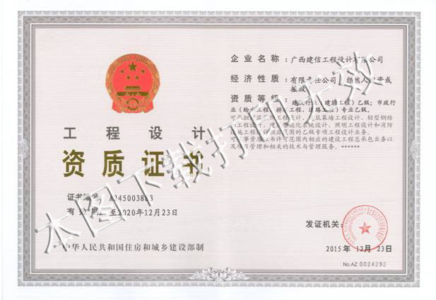 继我集团广西建信工程设计有限公司2015年12月11日成功获得工程设计市政行业(给水工程、排水工程)专业乙级资质增项后,根据广西建设网2015年12月31日发布公告,我公司顺利通过资质审查,成功将市政行业(道路工程)专业晋升为乙级资质!