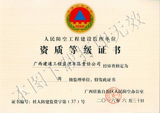 根据国家人防办《人防工程监理行政许可资质管理办法》以及《广西壮族自治区人民防空行政审批操作规范》等有关规定,广西建通工程监理有限责任公司人防工程监理丙级资质证书在有效期届满后,及时向自治区人防主管部门提交资质延续申请材料,并于2016年6月30日成功获得新颁发的人防工程监理丙级资质证书。该资质业务范围为:本行政区域内抗力等级6级、6B级及建筑面积1万平方米以下的人防工程监理业务, 证书有效期至2017年8月30日。