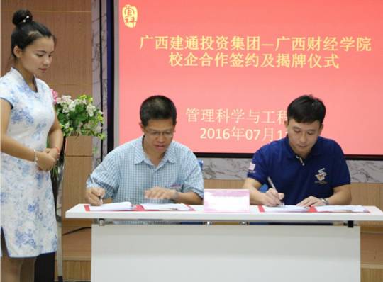 2016年7月11日,广西乐鱼(中国)一站式服务平台-广西财经学院校企合作签约及揭牌仪式在广西财经学院隆重举行。集团邓安杰董事长带领集团高层及监理公司、检测公司代表,广西财经学院总会计师宁旭初带领的招就处、管理学院领导班子成员及师生代表出席了签约及揭牌仪式。仪式由管理科学与工程学院工程造价系主任梁华主持,宁旭初总会计师、邓安杰董事长分别作了热情洋溢的发言。