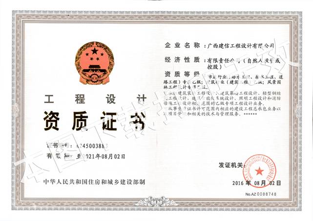 2016年08月09日,从广西住房和城乡建设厅官网再传来喜讯,我集团旗下子公司广西建信工程设计有限公司顺利通过了广西住建厅资质审查,成功增项风景园林工程设计专项乙级资质。该资质可承揽中型以下规模风景园林工程项目和投资额在2000万元以下的大型风景园林工程项目的设计。现广西建信工程设计有限公司拥有资质为:建筑行业(建筑工程)乙级、市政行业(给水工程、排水工程、道路工程)专业乙级、风景园林工程设计专项乙级和城乡规划编制乙级。
