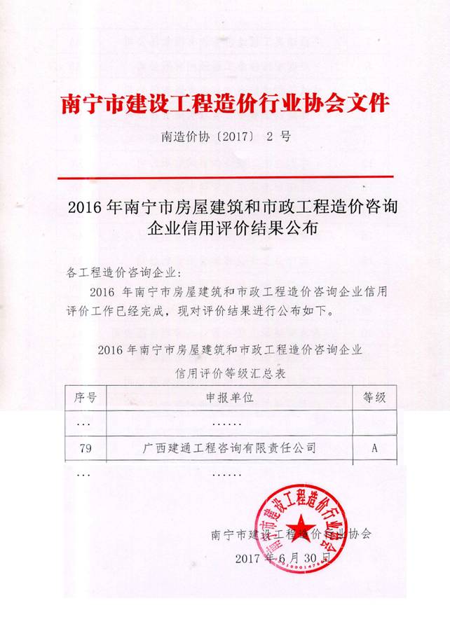2017年6月30日从南宁市建设工程造价行业协会传来喜讯,乐鱼(中国)一站式服务平台旗下子公司广西建通工程咨询有限责任公司获得由该协会颁发的2016年南宁市房屋建筑和市政工程造价咨询企业信用评价A等级荣誉。