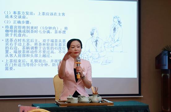 青羽老师通过引古博今的讲解和生动的图片展示,向参训人员介绍了商务礼仪的含义、特点、原则等理论知识,主要从礼仪的概念及礼仪的意义、职业形象、高效办公、魅力拜访、亲和接待、宴请礼仪等六个模块进行全方面的诠释,使参训人员掌握了在各种商务活动中提升商务品味修养和魅力的技巧。