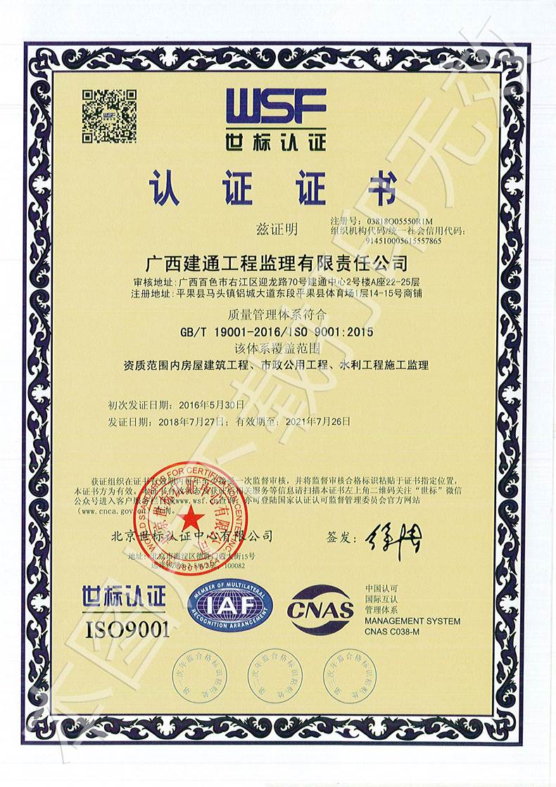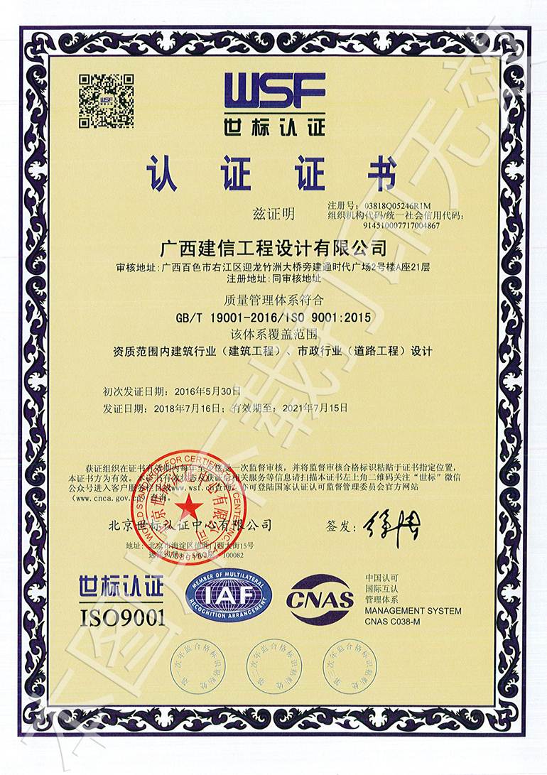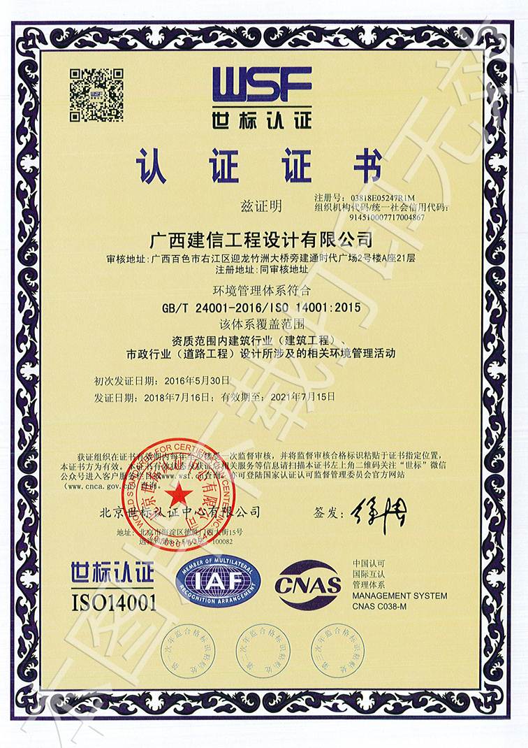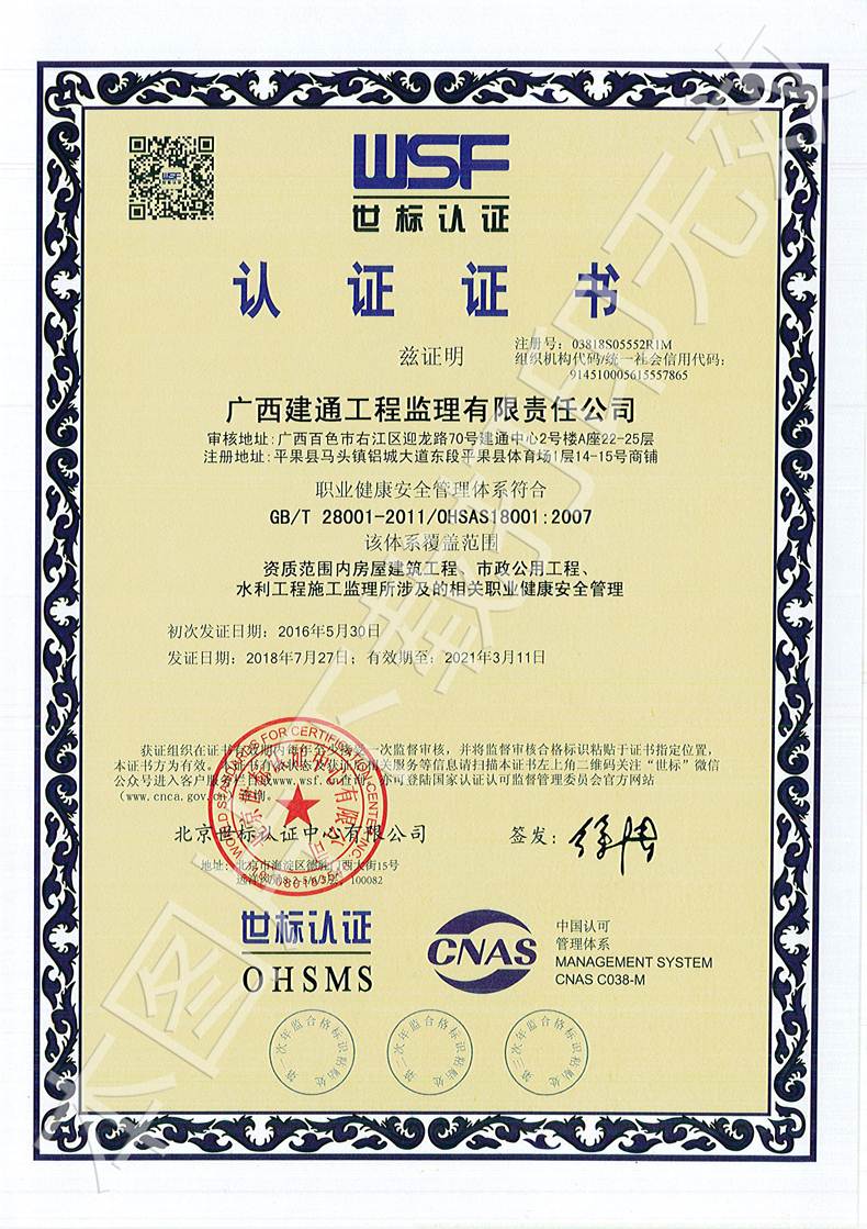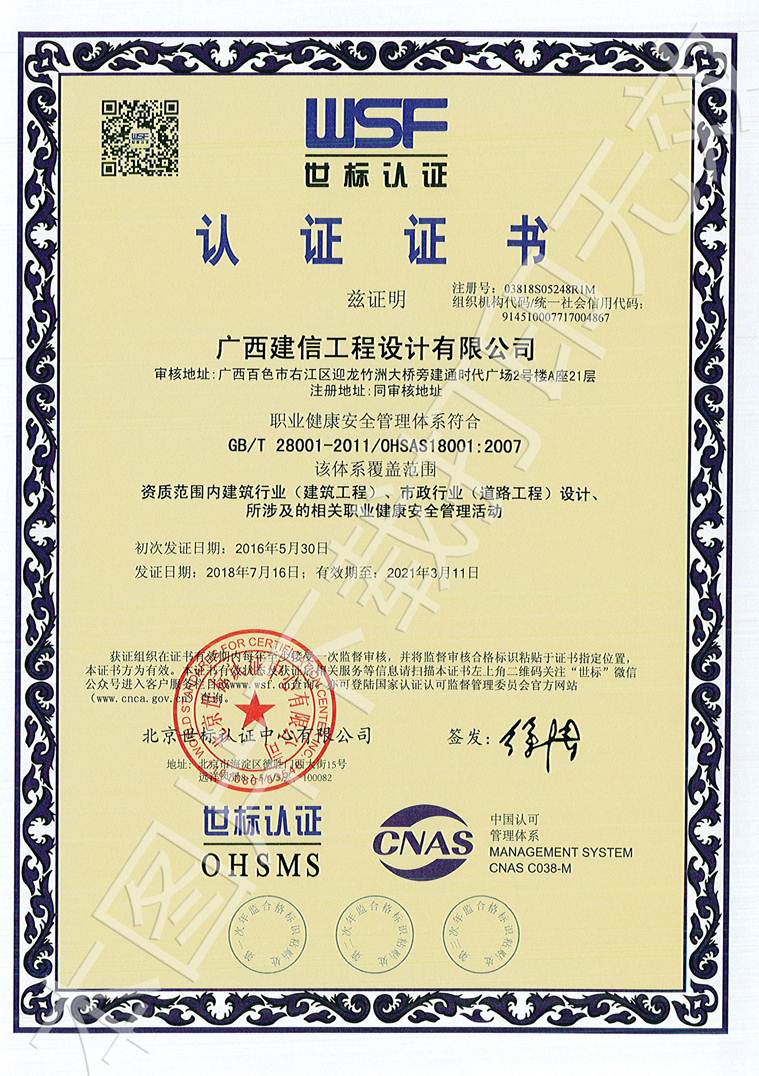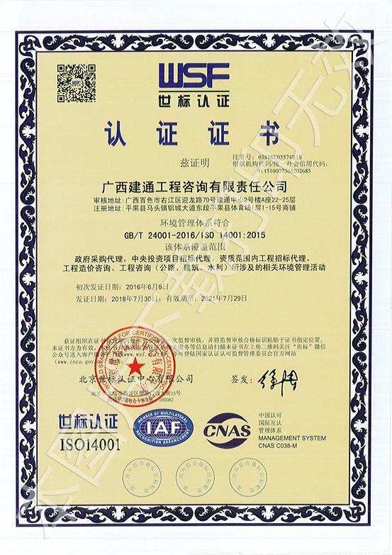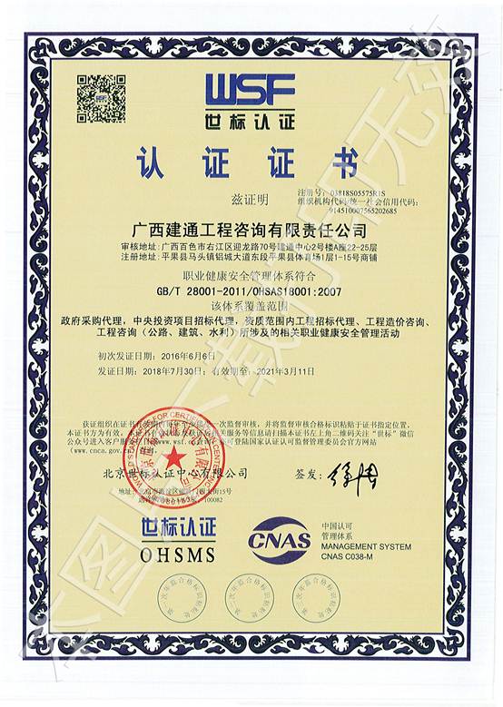 北京世标认证中心有限公司分别于2018年6月27日-6月30日、6月27日-7月3日、7月3日-7月6日对我集团旗下:广西建信工程设计有限公司、广西建通工程咨询有限责任公司、广西建通工程监理有限责任公司共三家子公司进行了《质量管理体系》(ISO9001:2015)、《环境管理体系》(ISO14001:2015)和《职业健康安全管理体系》(OHSAST18001:2007)评审。在集团领导和各部门同事的大力支持配合下,保证了此次审核工作的顺利通过,并于2018年8月8日获得了世标认证委员会颁发的合格证书。这次世标认证审核的通过对集团业务的发展、招投标等方面将产生积极的影响力,对不断提高管理水平、员工环保意识以及提高公司市场竞争力有很大的促进作用。