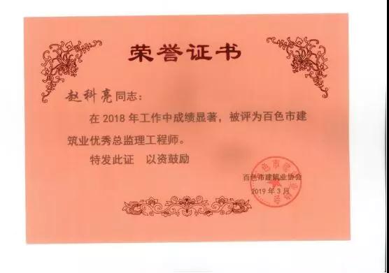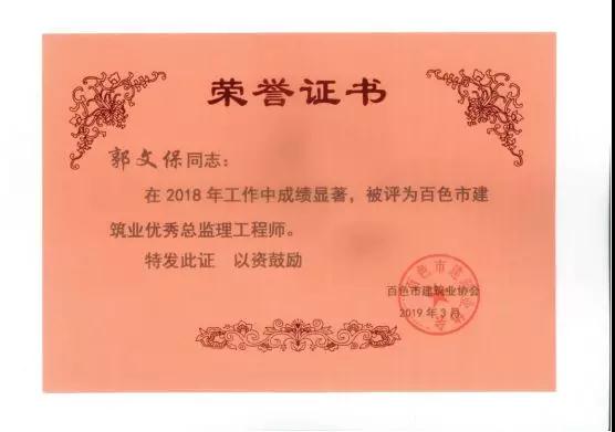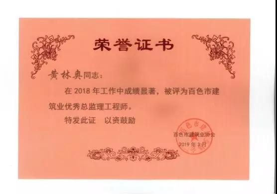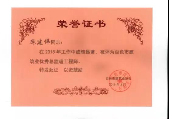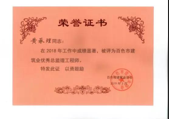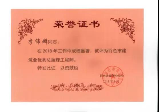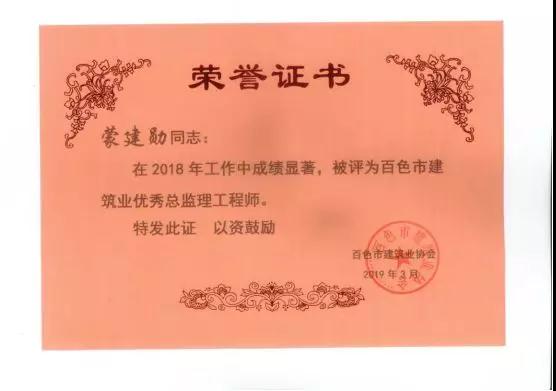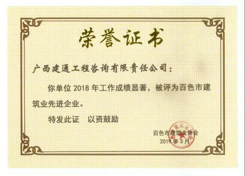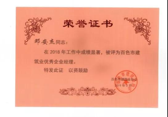 一、广西建通工程咨询有限责任公司荣获《2018年度百色市建筑业先进企业》、邓董事长荣获《2018年度百色市建筑业优秀企业经理》荣誉称号;