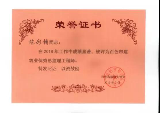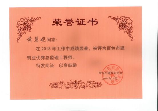 三、广西建通工程监理有限责任公司名下技术总监:刘忠志、蒙建勋、黄承理、赵科亮、麻建伟、卢贵修、黄慧妮、陈 垌、苏海洋、罗爱梅、陈彩绣、黄林奥、莫庆华、李伟群、郭文保等15位荣获《2018年度百色市优秀总监理工程师》荣誉称号;