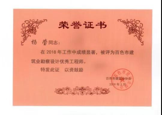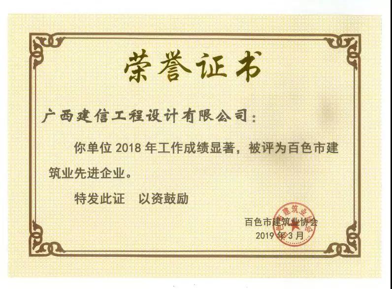 四、广西建信工程设计有限公司荣获《2018年度百色市建筑业先进企业》、韦霖荣获《2018年度百色市勘察设计优秀注册建筑师》、刘剑荣获《2018年度百色市勘察设计优秀注册结构师》、杨莹、邓志权荣获《2018年度百色市勘察设计优秀工程师》的荣誉称号。
