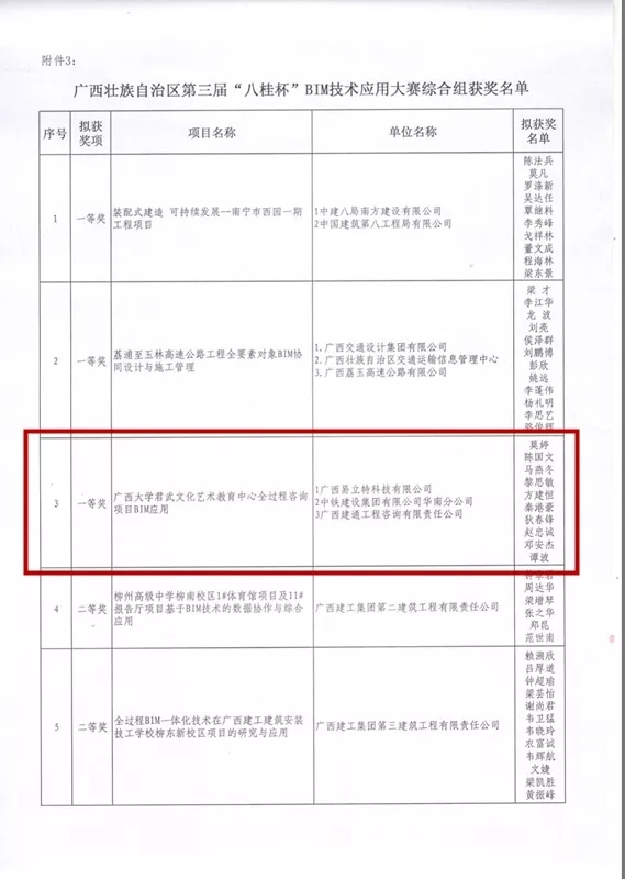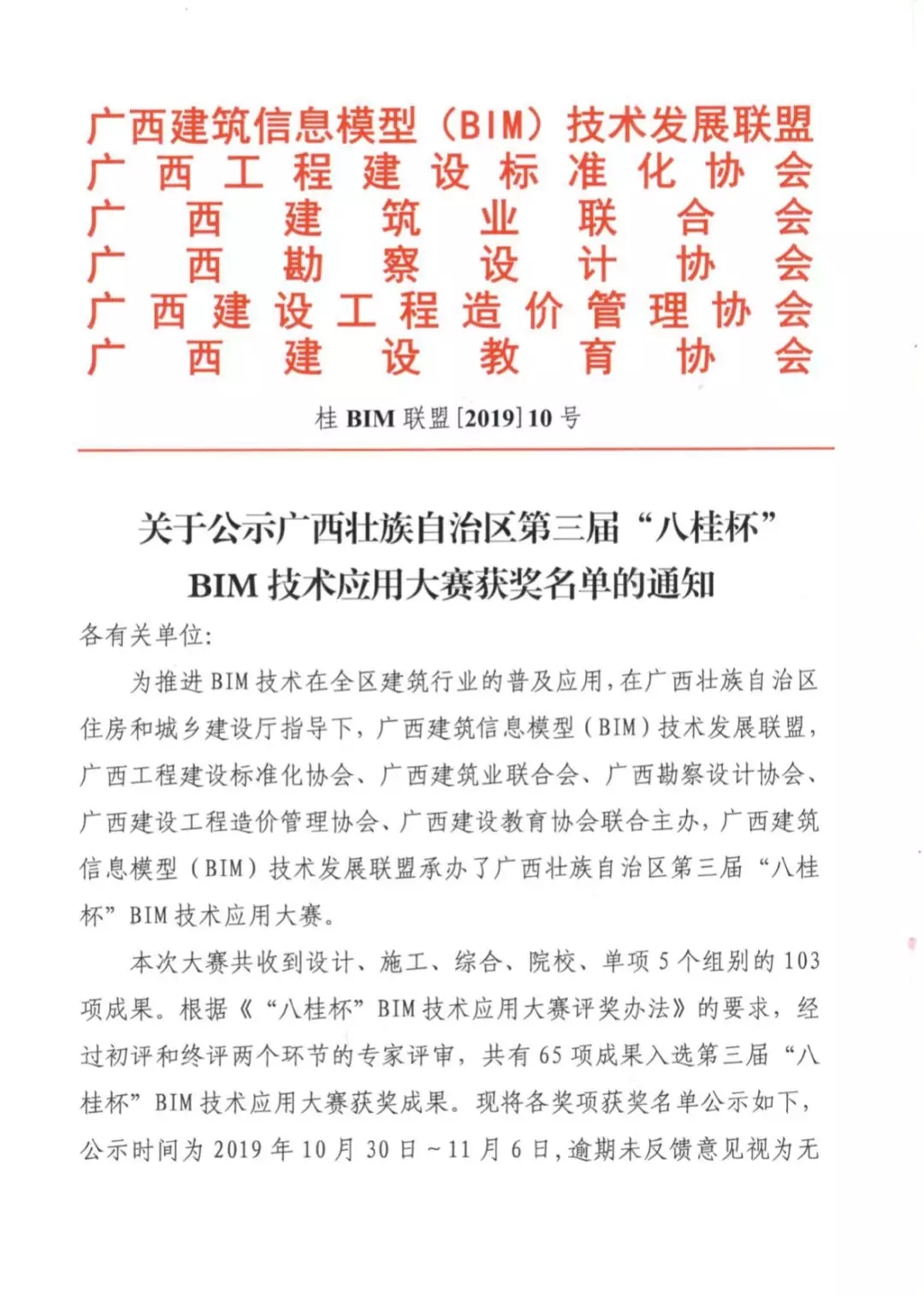 本项赛事为区内影响力颇高的BIM大赛,是面向大部分勘察设计、施工企业的业界实力比拼,具有广泛影响力。本次大赛共收到来自全区设计、施工、综合、院校、单项5个组别的103项成果参赛。经过各方面的激烈角逐,我公司最终在多个项目中脱颖而出,喜摘综合组一等奖,本年度再一次斩获“八桂杯”全区BIM大赛奖项,也标志着我公司BIM技术应用达到了行业先进水平。
