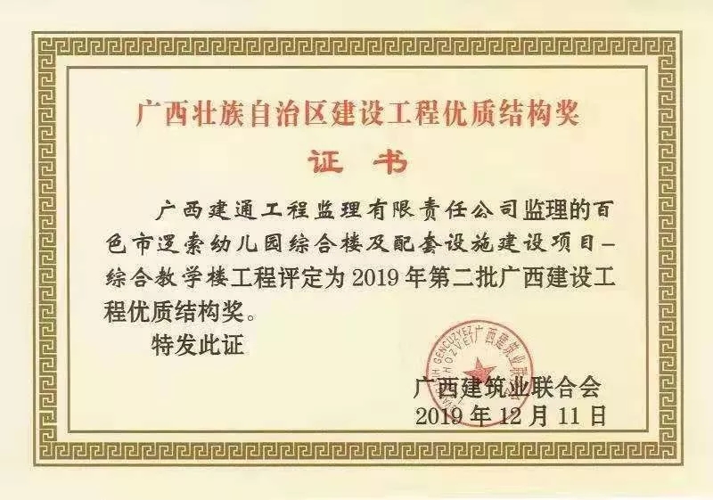 我集团子公司承接的《百色市逻索幼儿园综合楼及配套设施建设项目-综合教学楼》项目被授予2019年第二批广西壮族自治区建设工程优质结构奖称号。