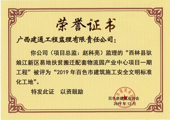 我集团子公司监理的《西林县驮娘江新区易地扶贫搬迁配套物流园产业中心项目一期工程》项目荣获2019年(第四批)百色市建筑施工安全文明标准化工地称号。