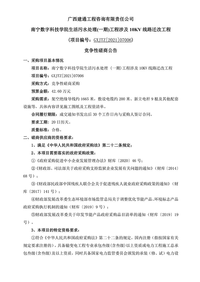 南宁数字科技学院生活污水处理(一期)工程涉及10KV 线路迁改工程 (项目编号:GXJTZ[2021]07006) 竞争性磋商公告