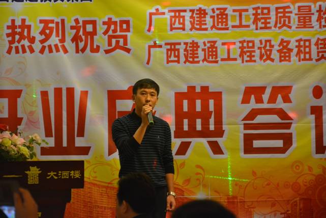 随后,集团副董事长兼桂昌公司总经理、设备租赁公司总经理黄树威也对开业活动做出了庆典致辞。他表示:广西建通工程设备租赁有限责任公司是广西乐鱼(中国)一站式服务平台于2013年4月注资100万元成立的具有独立法人资格的子公司,业务范围包括各种建筑设备、机械设备租赁的专业租赁公司,目前主要服务于百色市场。一年多来,设备租赁公司在集团的正确领导下,以提供“专业、迅速、安全”服务为目标,着重营造集安装、拆除、维修于一体的高素质员工队伍,先后参与了百色地区多项重点大型工程建设,与一批优秀的建筑企业建立了良好合作关系。现公司拥有全新卡特320D挖掘机一台、外架钢管1000吨,扣件9万套及相关机械设备,全部用于建筑工地的施工生产需求。2015年建通设备租赁公司将全心全意为客户服务,急客户之急、想客户所想,力争做到让每一位合作伙伴用得省心!用得称心!用得放心!