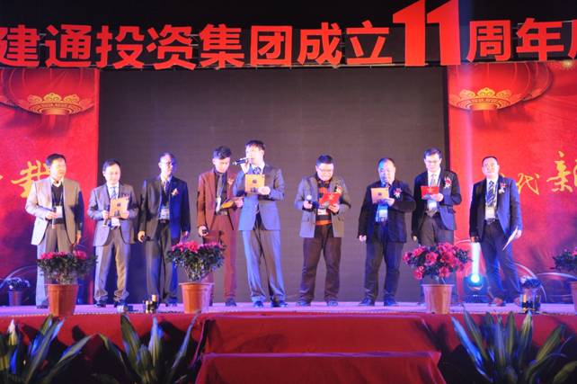 庆典晚宴上,集团邓安杰董事长在致辞中对各位嘉宾客户的到来及全体员工的多年辛勤付出表示衷心地感谢,他指出2014年是集团睿智成长的一年,也是充满了艰辛与挑战的一年,集团董事会审时度势及时适度调整集团战略和管理模式,在激烈的市场竞争中及时适应了经济发展的新常态,呈现出逆势而上的发展态势,在做大做强传统主业的前提下,集团董事会创造性的进行了国内资本市场战略发展布局,在人才培养,资质管理、集团文化建设、市场拓展、品牌加盟,房地产投资开发等各方面取得了令人欣慰的成绩,2014年度集团及下属子公司取得了含房屋建筑工程监理甲级、市政公用工程监理甲级在内10余个资质,集团旗下子公司广西建通工程咨询有限责任公司在上海股权托管交易中心成功挂牌,标志着集团在登陆国内创业板上市的路途中迈出了最为关键的一步,也预示着集团进入了一个新的历史发展阶段。2014年,建通集团继续积极参与社会公益事业,回馈社会、回报家乡,其间包括向百色教育基金会捐赠100万元捐赠百色中学建通特困班、出资100万元承办2015——2019年百色市建通杯羽毛球超级争霸赛,以自身行动大力支持百色教育和体育事业发展。