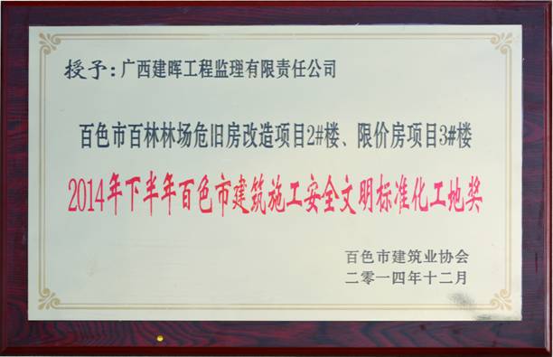 热烈祝贺集团广西建通工程监理有限责任公司监理项目荣获2014年下半年百色市建筑施工安全文明标准化工地奖