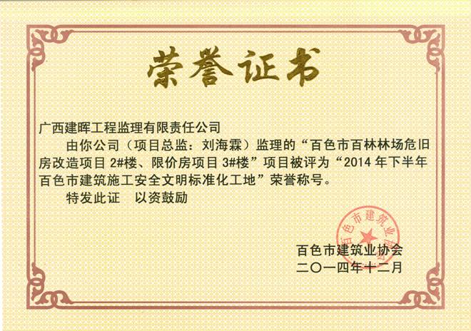 2014年12月,集团下属子公司广西建通工程监理有限责任公司(原名广西建晖工程监理有限责任公司)监理二所刘海霖监理的“百色市百林林场危旧房改造项目2#楼、限价房项目3#楼”,在2014年下半年百色市住房和城乡规划委员会下属机构百色市建筑业协会组织的监理项目评比中荣获《2014年下半年百色市建筑施工安全文明标准化工地奖》。